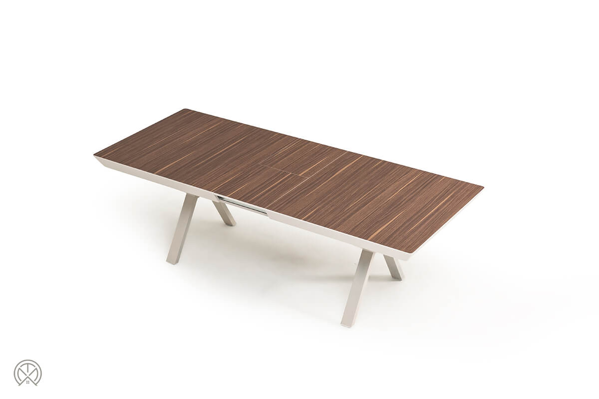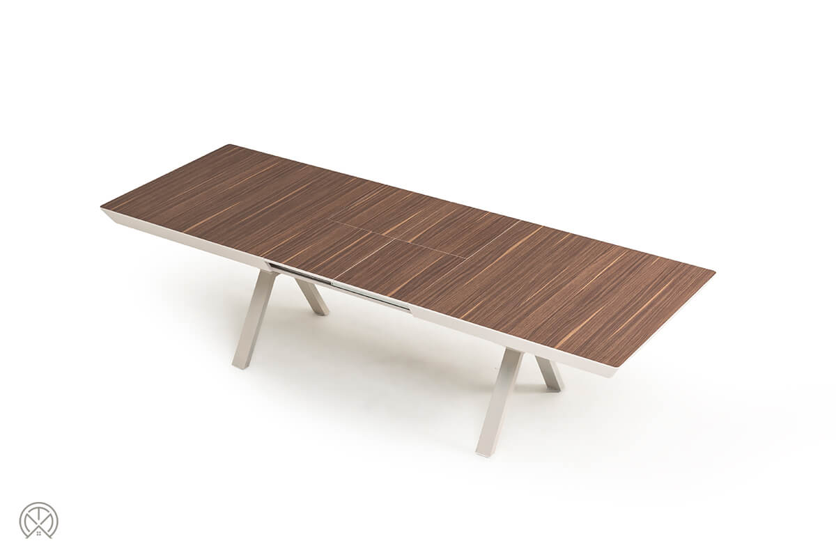 Der Hummer Ausziehbarer Esstisch definiert Flexibilität neu. Er kombiniert ein warmes Finish in Nussbaum-Optik mit einem kühlen, modernen Metallgestell und wird so zum Mittelpunkt jedes Esszimmers. Dieses Modell ist nicht nur ein Design-Statement, sondern auch ein Meister der Verwandlung, ideal für alle, die das Beisammensein mit Familie und Freunden lieben.