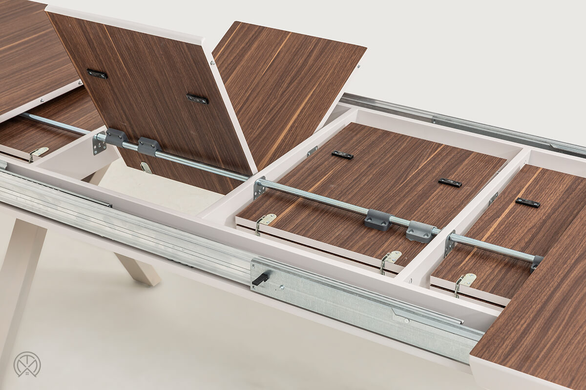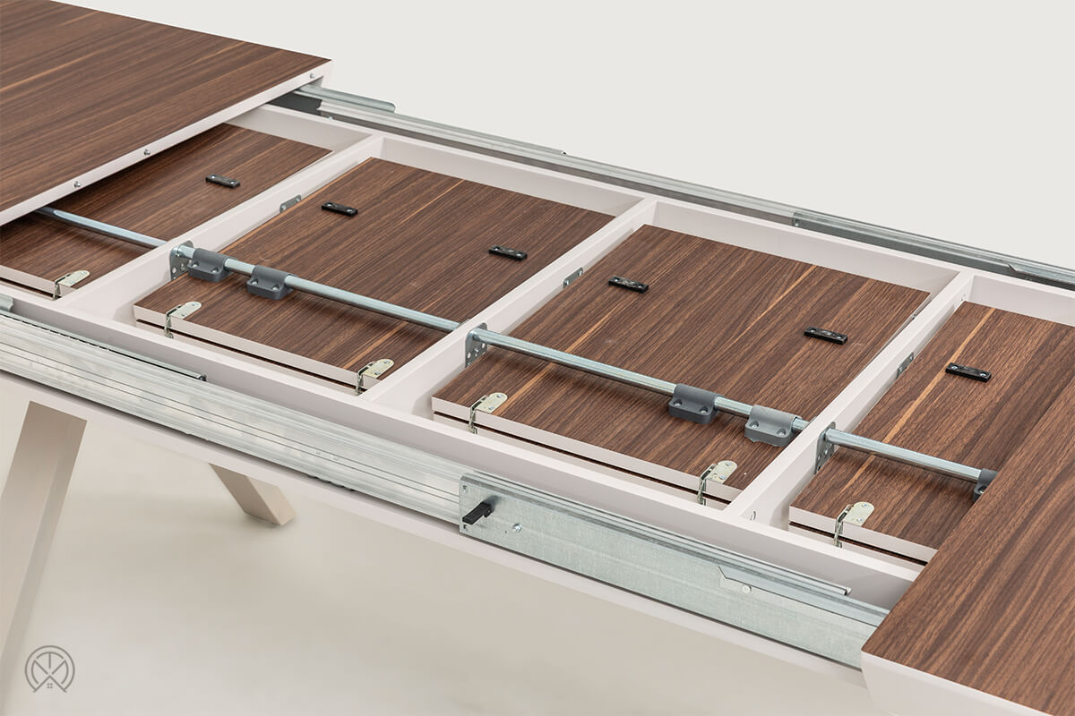 Das herausragendste Merkmal des Hummer Tisches ist sein genialer Auszugsmechanismus. Vergessen Sie das mühsame Lagern von schweren Einlegeplatten im Schrank oder Keller. Dank des integrierten Schmetterlingsauszugs sind die vier 40-cm-Verlängerungsplatten direkt unter der Tischplatte verborgen. Sie lassen sich mit wenigen Handgriffen ausklappen und verwandeln den Tisch im Handumdrehen.