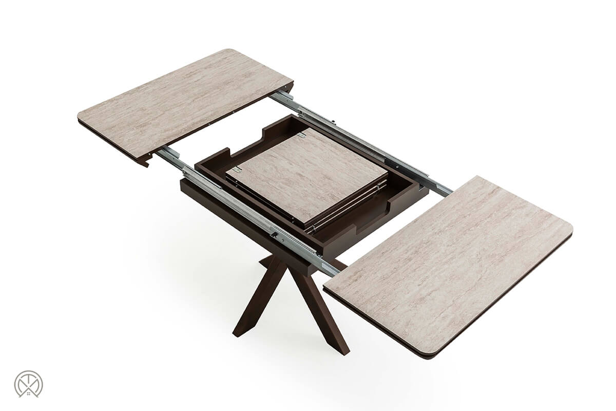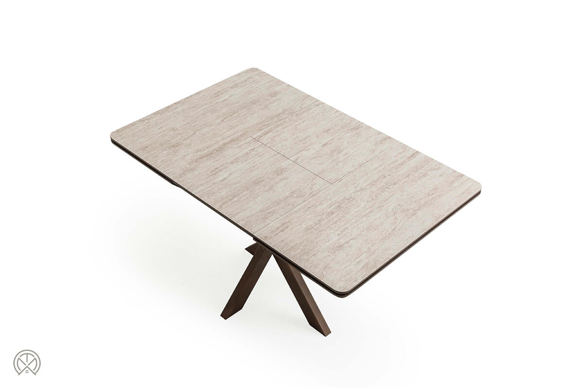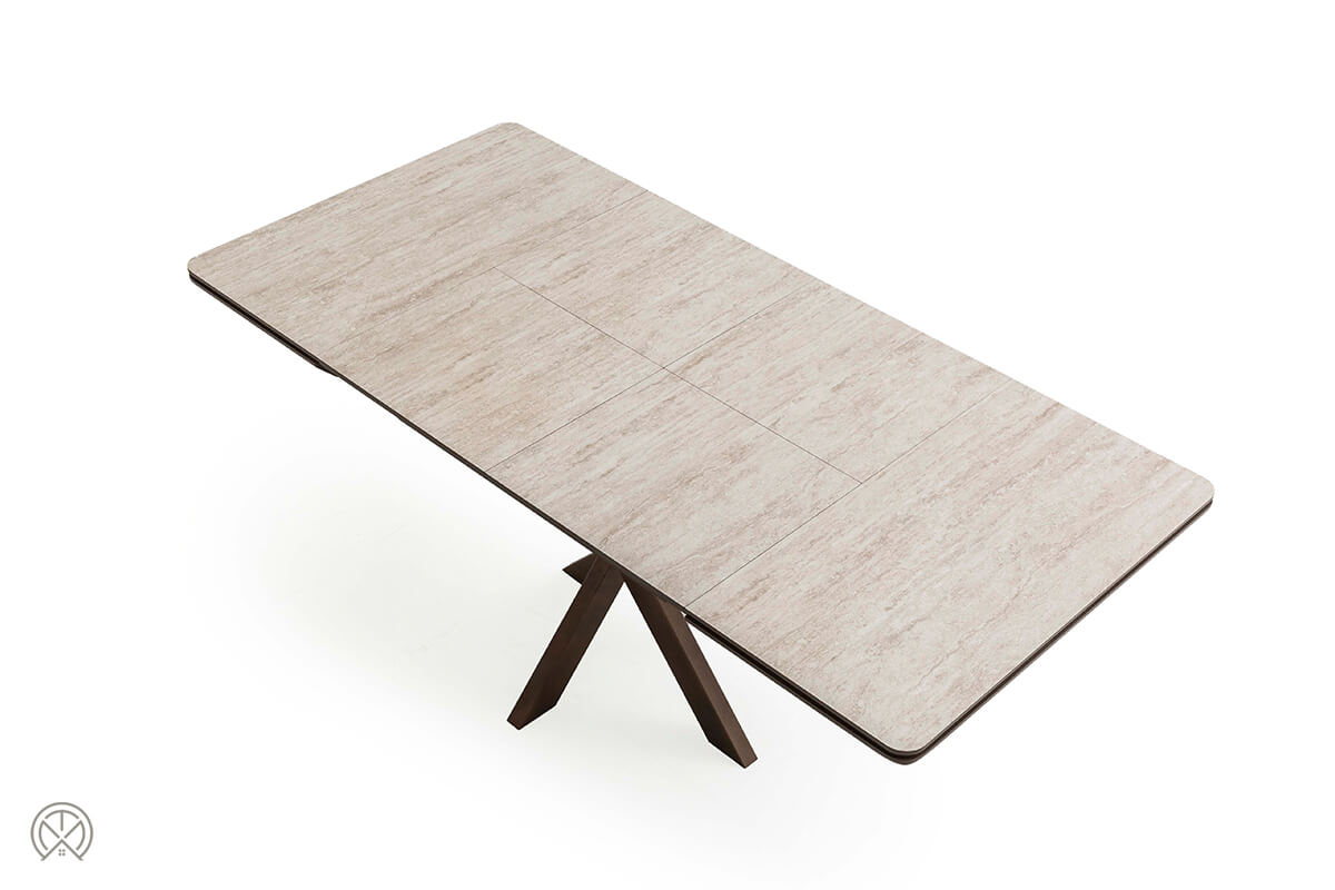 Der Grande ist nicht nur praktisch, sondern auch ein echter Blickfang. Die Tischplatte in heller Marmor- oder Travertin-Optik wirkt edel und modern. Die sanft abgerundeten Ecken („Soft-Edge“) verleihen ihr eine weiche Haptik und nehmen dem quadratischen Design die Strenge. Dieses helle Element ruht auf einem soliden, zentralen X-Gestell (auch Spinnenfuß genannt) in dunkler Holz-Optik. Dieses Gestell bietet nicht nur enorme Stabilität, sondern sorgt auch für maximale Beinfreiheit an allen Seiten des Tisches – ein klarer Vorteil gegenüber Tischen mit vier Eckbeinen.