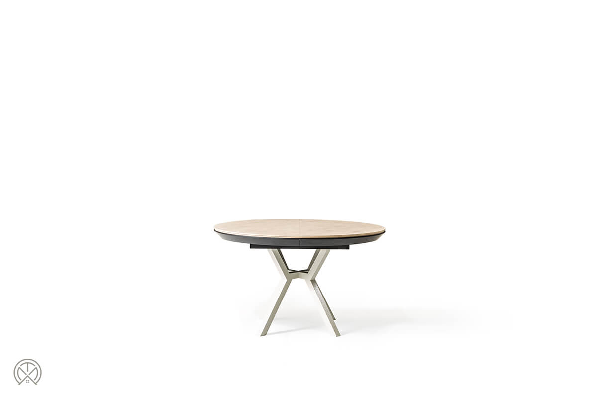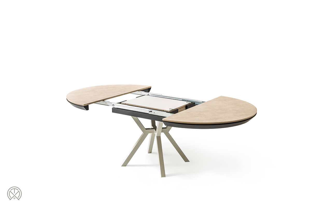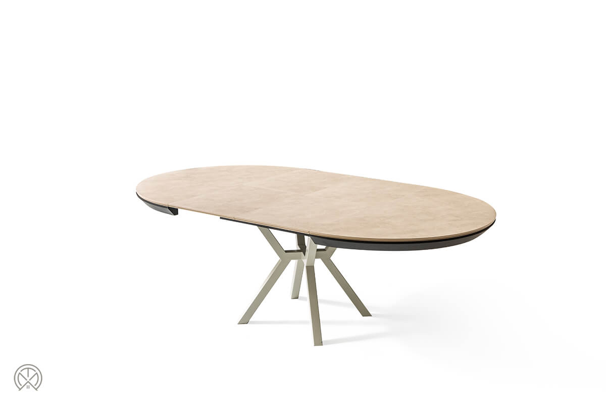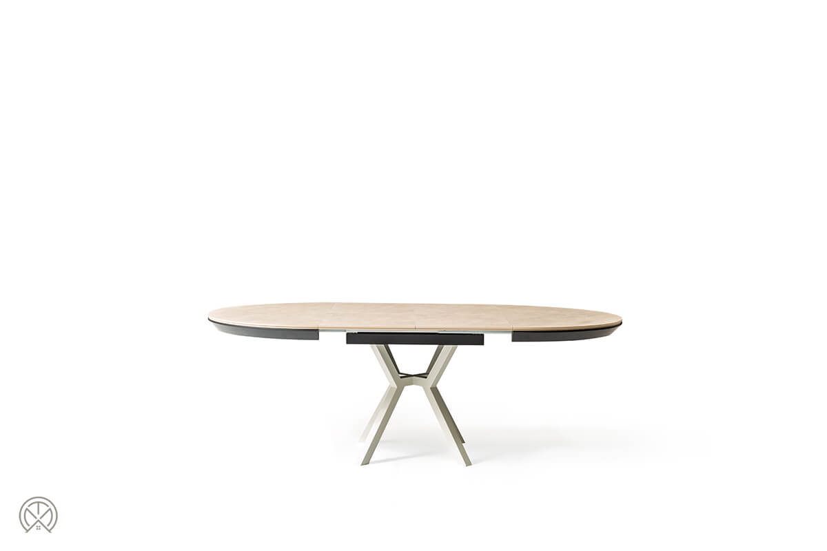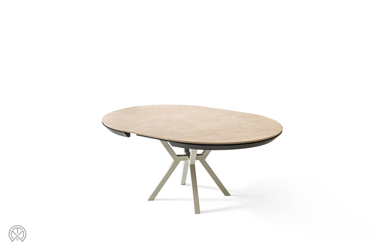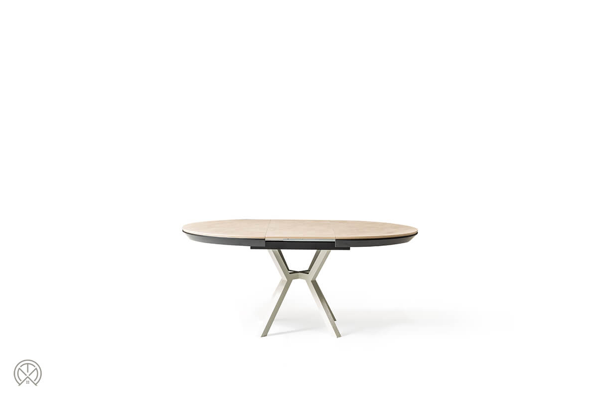 In seiner kompakten Grundform als runder Tisch mit 130 cm Durchmesser ist der Marin ideal für den Alltag. Kommen jedoch Freunde oder Familie zu Besuch, zeigt er seine wahre Größe. Dank des intelligenten, integrierten Schmetterlingsauszugs verwandelt er sich mühelos in eine beeindruckende ovale Tafel von 226 cm Länge.