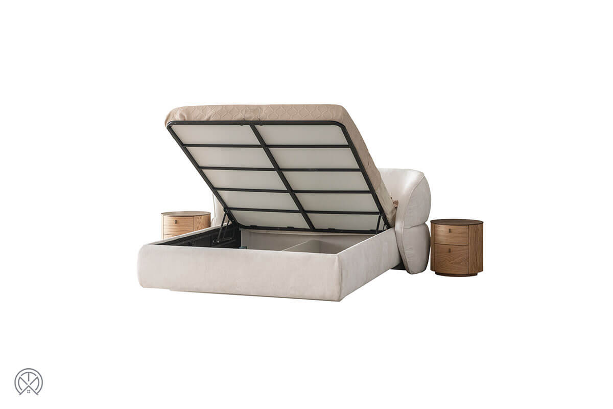 Das Oslo Polsterbett mit Bettkasten fügt sich perfekt in modulare Schlafzimmerstrukturen ein. Insbesondere den Bettkasten-Mechanismus haben wir so konzipiert, dass Nutzer jeden Alters ihn bequem öffnen und schließen können. Dank des gedämpften Systems (Gasdruckfedern) bieten wir einen schnellen und sicheren Zugriff auf den Stauraum.